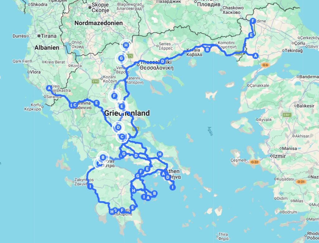 Nach 32 Übernachtungen in der Hellenischen Republik habe ich heute Nachmittag Griechenland in Richtung Nordmazedonien verlassen. Griechenland war einerseits ein Reiseziel, andererseits diente es uns auch als Drehscheibe. Zweimal bin ich von Athen aus für je zehn Tage in die Schweiz zurückgekehrt. Griechenland diente uns auch als Durchreiseland auf dem Weg in die Türkei und in die Kaukasusstaaten Georgien und Armenien. Daneben haben wir aber auch ganz gezielt Orte und Regionen auf dem Peloponnes angesteuert. Aufgrund dieser verschiedenen Zielsetzungen erscheinen die Wege, die wir in Griechenland zurückgelegt haben, sehr wirr. Der Start war eher schwierig, weil das Wetter schlecht war. Dann haben wir ordentlich Zeit in die Suche nach einer Werkstatt investieren müssen, die in der Lage war, Hopos Federung zu reparieren. Und auf dem Weg in die Türkei und zurück haben wir auch Gegenden durchfahren, die nicht allzu attraktiv waren. Wir haben aber auch sehr viel Schönes in Griechenland sehen und erleben dürfen. So sind etwa die Meteora-Klöster extrem beeindruckend und die Hauptstadt Athen hat enorm viel zu bieten. Ganz speziell war es auch, bei kühlen Lufttemperaturen im warmen Schwefelbach bei den Thermophylen zu baden. Fasziniert hat uns vor allem aber der Peloponnes, wo wir tolle Küsten, wunderschöne kleine Fischerdörfer und wildromantische Täler und Schluchten angetroffen haben. Speziell gut gefallen hat uns auch, dass hier vieles noch recht authentisch ist (je südlicher, desto stärker). Wenn es sich irgendwie einrichten lässt (und davon gehen wir doch aus), kommen wir bestimmt wieder zurück nach Griechenland, mit dem Ziel, insbesondere den Peloponnes noch besser kennenzulernen.
