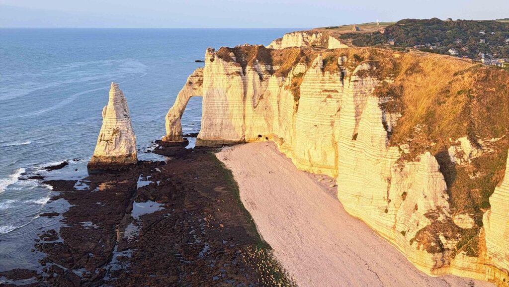 Wir übernachten heute in Étretat, einem Ort mit bescheidenen 1’300 Einwohner nordöstlich von Le Havre. Étretat ist einer der grössten touristischen Hotspots im Norden Frankreichs. Bisher hatten wir immer den Eindruck, dass wir zwei deutschsprachige Reisende unter sehr vielen Franzosen sind. Heute war das Publikum Mulitkulti. Sehr viele Italiener und Spanier, Deutsche, Holländer, Belgier, aber auch Inder und Asiaten. Und zwei aus der Schweiz neben einigen Franzosen, die natürlich auch hier anzutreffen sind. Dass Étretat so viele Menschen anzieht hat seinen guten Grund. Die Kreidefelsen mit ihren Felsentoren sind wirklich eindrücklich. Sie sind so schön anzuschauen, dass ich sie gerne nochmals in meinem Blog abbilde. Es dürfte sich aber definitiv um die letzte solche Aufnahme handeln. Morgen werden wir die Seine westwärts überqueren und dort werden wir dann primär wieder auf flache Sandstrände stossen.