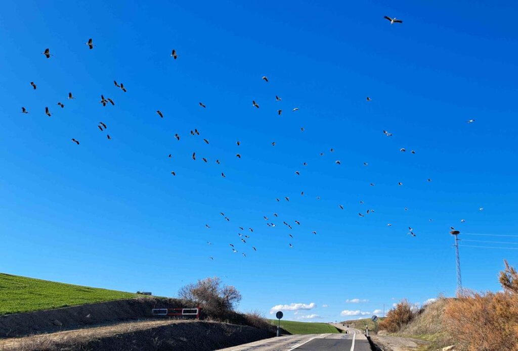 Nahe beim Castillo de Torres Cabrera südöstlich von Córdoba bin ich auf rund ein Dutzend Störche gestossen, die in einer grünen Matte auf der Suche nach Nahrung waren. Währenddem ich ihnen kurz zuschaute, flog plötzlich ein Schwarm von Störchen über mir hinweg. Ich schätze, dass es um die hundert Vögel waren, die am Himmel an mir vorbeizogen. Eindrücklich.
