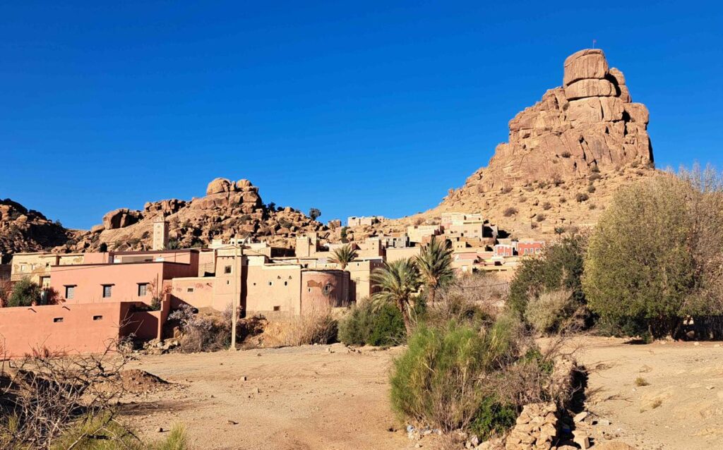 Tafraoute mitsamt Umgebung ist bekannt für seine tolle Landschaft und viele skurrile Felsformationen. Im Nachbarort Aguerd Oudad trifft man auf den „Hut Napoleons“, der über das Dorf wacht. Noch kurz zum Wetter: gestern war es ja den ganzen Tag über bedeckt und trüb. Beim Aufstehen heute Morgen war der Himmel immer noch vollständig wolkenverhangen. Innert einer Stunde waren dann aber alle Wolken weg und wir durften wieder einen herrlichen Tag mit sehr viel Sonne geniessen. Allerdings stieg das Thermometer heute nur noch auf 13 Grad an, was teilweise darauf zurückzuführen ist, dass wir uns auf über tausend Meter Höhe befinden.