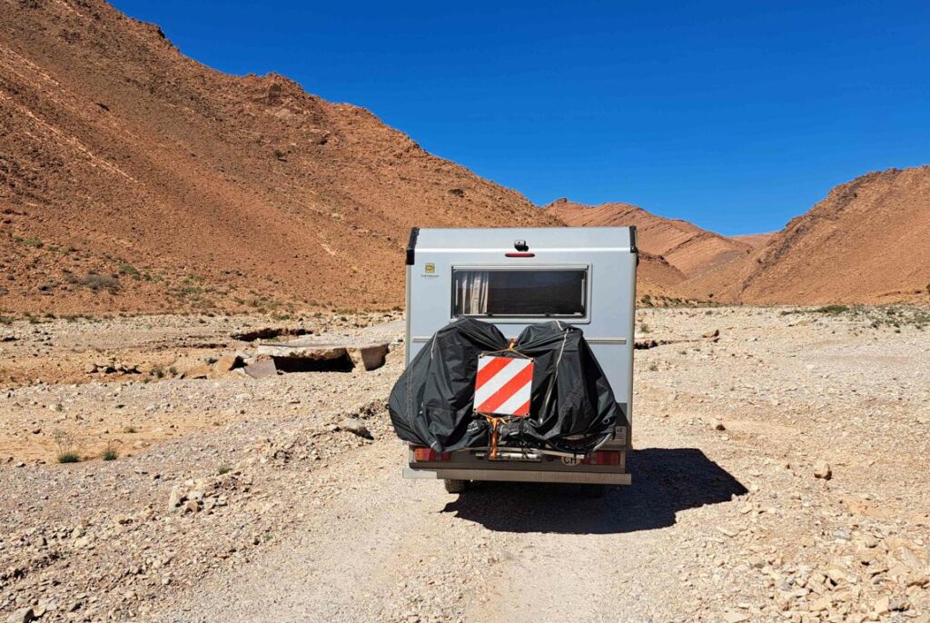 Auf der Rückfahrt haben wir das Vallée d’Ait Mansour grossräumig umfahren (etwas anderes als grossräumige Umfahrungen gibt es hier in den Bergen gar nicht). Das Landschaftsbild hat sich grundlegend geändert. Hier sind wir mehrheitlich auf rötlich-braune Steinwüsten gestossen. Auch diese Landschaften sehen superschön aus, speziell bei so tollem Wetter wie heute. Die Strasse ist hier ebenfalls recht eng. An etlichen Stellen hat der Fluss Brücken und Übergänge weggespült. Diese Stellen sind nun auf kürzeren Schotterpisten zu umfahren. Ein 4×4-Antrieb ist nicht zwingend erforderlich, aber sicher kein Nachteil. Wichtig ist, dass man ausreichend Bodenfreiheit hat. Sportwagen haben hier definitiv nichts verloren.