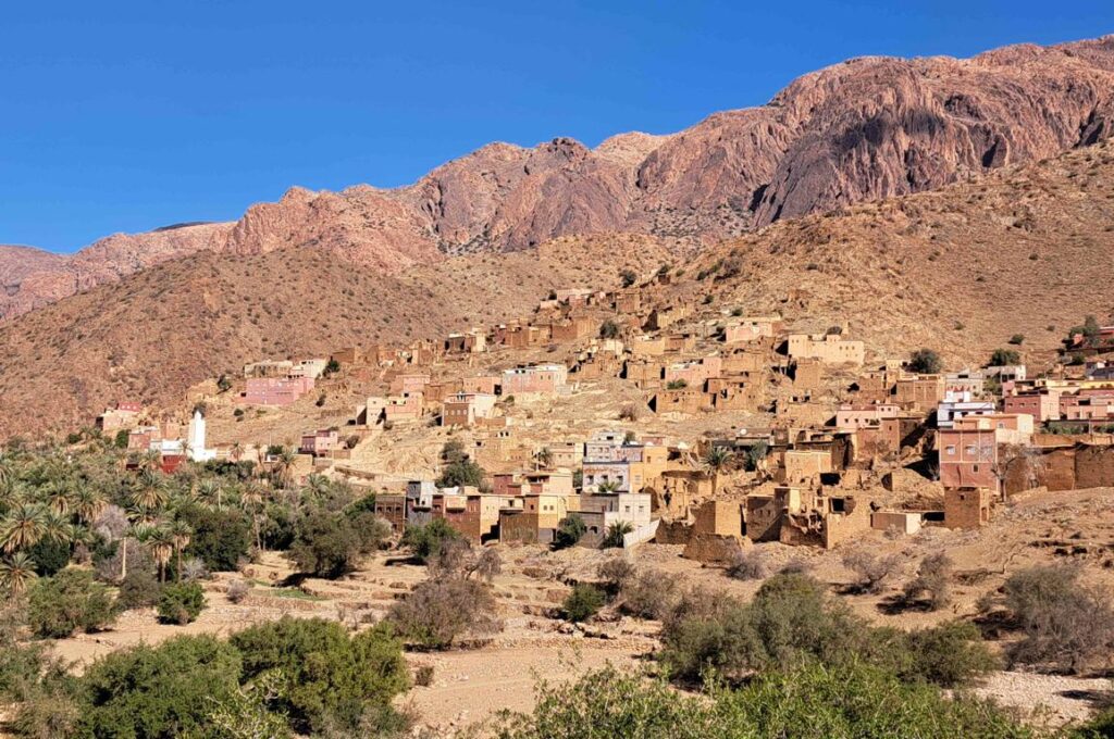 Nördlich von Tafraoute liegt die Gebirgskette des Jbel Lekst (der höchste Gipfel befindet sich auf 2’349 Metern). Darunter erstreckt sich das Tal der Ammeln. Tönt nach Insekten, ist es aber nicht. Die Ammeln sind ein hier lebender Berberstamm. Das Tal ist für marokkanische Verhältnisse sehr fruchtbar (Getreide, Gemüse, Obst, Feigen, Datteln, Mandeln). Die kleinen Dörfer kleben zum Teil wie Vogelnester an den Hängen der steil aufragenden Felswände. Eine wirklich traumhaft schöne Gegend.