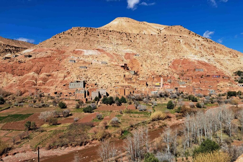 Auf dem Weg von Telouet nach Ait Ben Haddou fährt man an etlichen kleinen Dörfern und Weilern vorbei. Viele Häuser sind aus rotem Lehm oder rotem Gestein gebaut. Sie heben sich damit kaum von der rötlichen Erde ab, die die hiesige Landschaft prägt. Eine weitere Farbe in die ganze Szenerie bringen die grünen Pflanzen und Bäume, die im Talgrund wachsen.