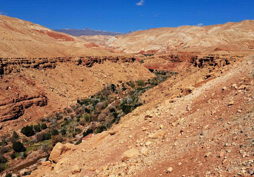 Die Flüsse, die die Täler des Atlasgebirges durchziehen, führen regelmässig Wasser. Die Talböden sind daher für marokkanische Verhältnisse recht fruchtbar und grün. An vielen Stellen bilden sie ein grünes Band in einer sonst sehr kargen aber farbigen Landschaft.