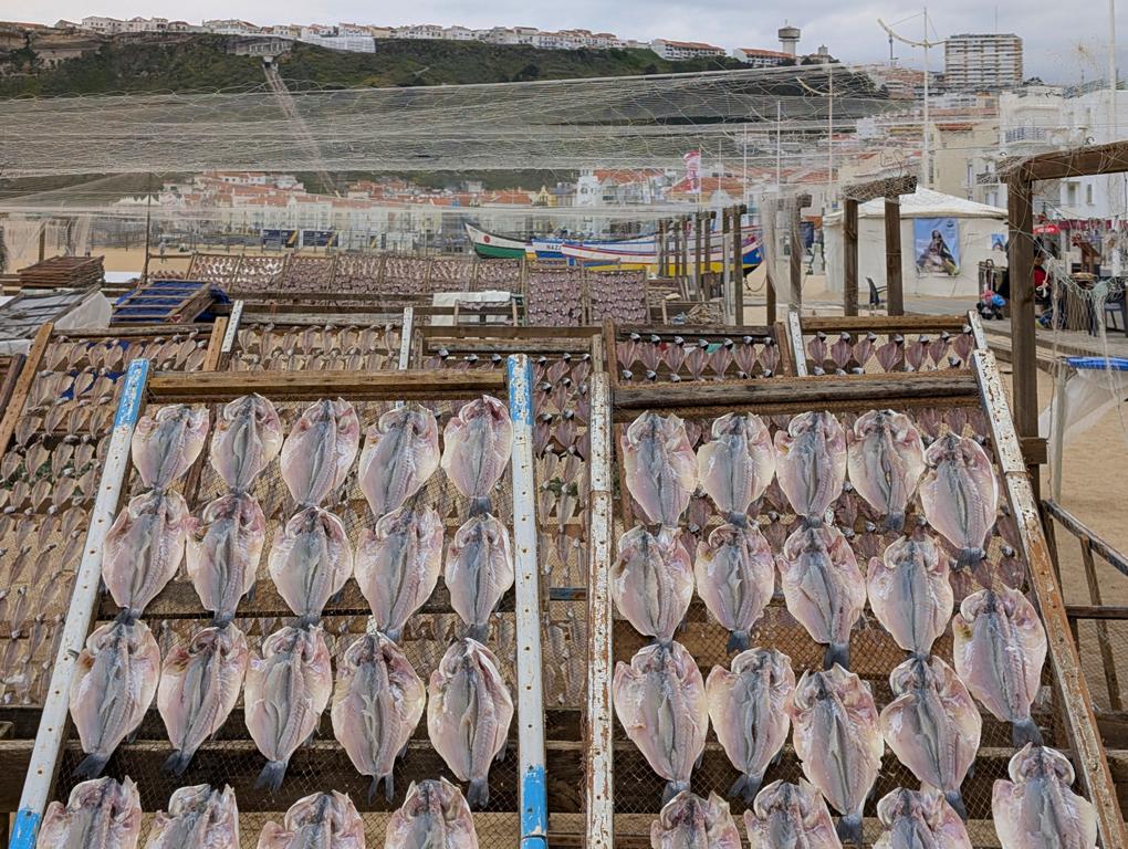 Auch wenn man viel reist, stösst man immer wieder auf Dinge, die man so noch nie gesehen hat. So ist es uns heute mit den Trockenfischen (Stockfischen) in Nazaré ergangen. In Skandinavien und Kanada haben wir schon hie und da gesehen, wie Fisch getrocknet wurde. Dort hing er aber immer in der Höhen an Seilen. In Nazaré werden die präparierten Fische hingegen in Gitter eingespannt und so luftgetrocknet. Und das direkt an der Promenade über dem breiten Sandstrand. Das Trocknen von Fischen hat in Nazaré eine lange Tradition und gehört zur lokalen Identität. Ansonsten ist Nazaré aber „bloss“ ein gewöhnlicher Badeort, der ausser einem breiten Strand und einer schönen Steilküste nicht allzu viel zu bieten hat. Zumindest nicht für unseren Geschmack.