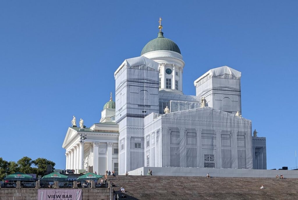 Der amerikanisch-bulgarische Künstler Christo und seine Frau Jeanne-Claude waren weltberühmt für ihre spektakulären Verhüllungen von Gebäuden und Landschaften. Beim heutigen Anblick der Kathedrale von Helsinki hätte man meinen können, dass hier ihre Nachfolger am Werk waren. Dem ist aber nicht so. Die Kathedrale wird zurzeit renoviert. Immer wenn wir auf verhüllte Sehenswürdigkeiten stossen, sind wir enttäuscht. Dem war heute nicht der Fall. Helsinkis Kathedrale sieht auch verhüllt blendend aus.