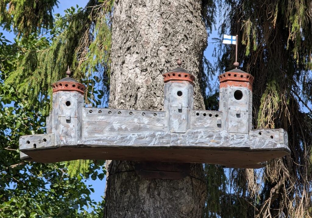 In Savonlinna sind wir nahe der Olafsburg auf ein Vogelhaus gestossen, das der Burg sehr gut nachempfunden ist. Originell und einen Blogeintrag wert, finden wir. Ob das Vogelhaus auch tatsächlich bewohnt ist, konnten wir nicht feststellen. Wir sehen hier oben immer wieder interessante Vögel. Diese hätten in diesem Vogelhaus aber definitiv keinen Platz.