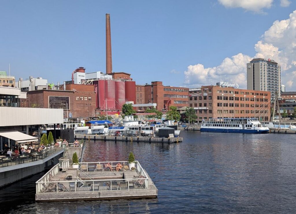 Bei der Anreise nach Tampere waren wir etwas skeptisch. Wir haben nicht so recht geglaubt, dass uns die Industriestadt gefallen wird. Tampere hat uns aber sehr gut gefallen. In der Stadt gibt es etliche interessante Gebäude zu sehen. Dem Tammerkoski-Fluss entlang kann man sehr schön flanieren. Es gibt etliche Bars und Restaurants, die beim heutigen tollen Wetter gut besucht waren. Die Lebensqualität in Tampere wird als hoch bezeichnet, was wir gut nachvollziehen können. Bekannt ist die Stadt auch für ihre öffentlichen Saunen. Auf dem Foto ist so eine abgebildet. Nach dem Schwitzen kann man sich im Fluss abkühlen und sich dann an der warmen Sonne entspannen.