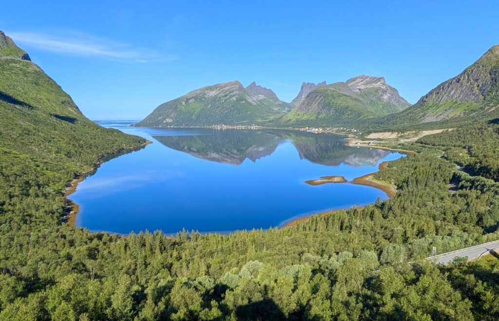 Wir sind beim nächsten Fjord angelangt, dem Bergsfjord. Die Norweger haben hier in der Höhe einen tollen Aussichtspunkt eingerichtet, von dem aus man den ganzen Fjord überblicken kann. Unser eigentlicher Plan war es, die Insel Senja heute Morgen zu verlassen. Weil das Wetter hier aber so herrlich ist und die Wetteraussichten für die Lofoten so schlecht sind, haben wir uns entschlossen, einen ordentlichen Teil unserer gestrigen Strecke rückwärtszufahren. Ein guter Entscheid, weil wir so einen Teil von Senja, der gestern noch wolkenverhangen war, im schönsten Lichte betrachten können.