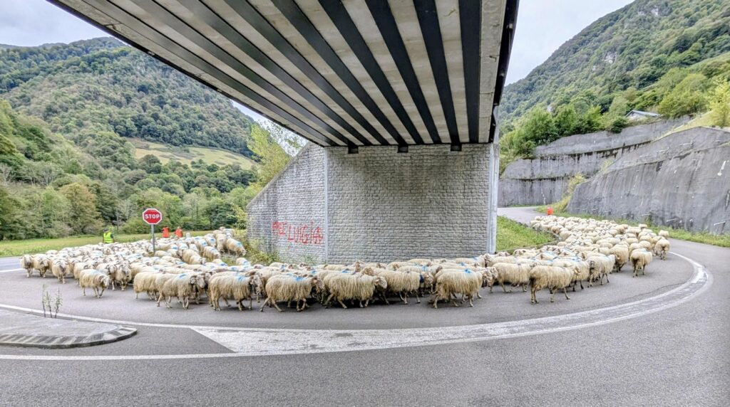 An was denkt man, wenn man draussen auf dem Lande auf eine lange stehende Kolonne auffährt? Meistens an eine Baustelle oder einen Unfall. Heute war es ein Schaftrieb, der den Verkehr zum Erliegen brachte. So viele Schafe auf einmal habe ich noch selten gesehen. Der Schaftrieb muss selbst für hiesige Verhältnisse etwas Spezielles gewesen sein. Mindestens acht Personen waren vor Ort, die den Verkehr regelten und zu den Schafen schauten.