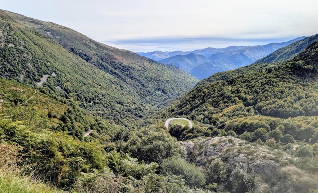 Zum ersten Mal seit langer Zeit habe ich am Port de Lers wieder richtig in die Ferne blicken können. Meist gibt es auf den Passstrassen ja „nur“ die direkt umliegenden Berge zu sehen. Eine richtige Weitsicht hat man nur selten. Bei der Abfahrt vom Port de Lers hatte ich im ersten Moment das Gefühl, aufs Meer hinauszusehen. So gut war die Fernsicht heute aber nicht. Was man am Horizont sieht, ist die Ebene südlich von Toulouse. Damit kann man auch gut leben. Wie unschwer zu erkennen ist, war das Wetter heute nicht mehr annähernd so toll wie gestern. Aber es war trocken, und das ist das Wichtigste für mich. Den elften Tag in Folge bin ich nun ohne Regen durchgekommen. Dafür bin ich dankbar, denn das hilft mir, gut vorwärtszukommen.