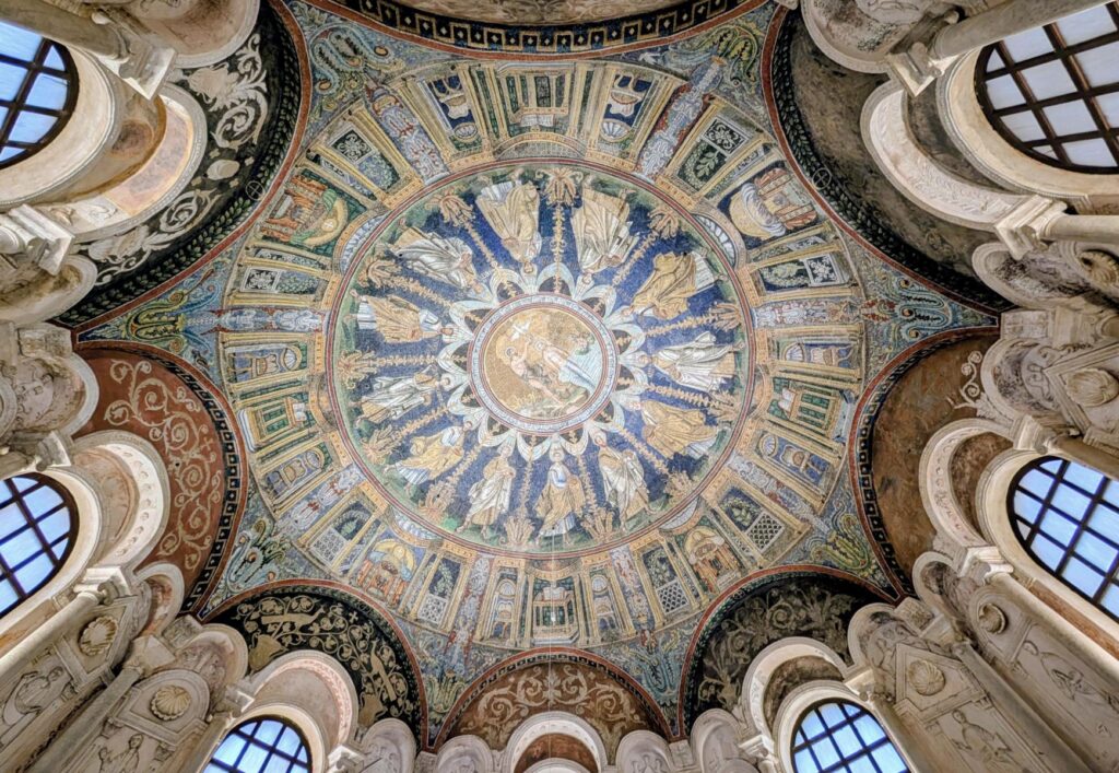 Das Battistero Neoniano ist die Taufkapelle der Kathedrale von Ravenna. Das Battistero ist im späten 4.und frühen 5. Jahrhundert errichtet worden und gehört damit zu den ältesten erhaltenen Bauwerken der Stadt. Besonders schön ist die Mosaik besetzte Kuppel, die die Taufe Christi im Fluss Jordan darstellt. Christus steht im Wasser, Johannes der Täufer giesst Wasser über sein Haupt. Darum herum werden in einem Kreis die zwölf Apostel dargestellt.