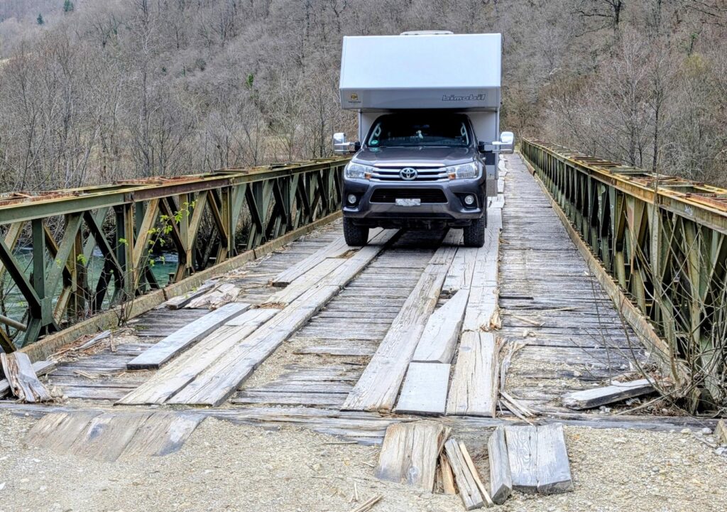 Die Strassen, auf denen ich in Bosnien und Herzegowina bisher unterwegs war, waren mehrheitlich gut. Die Brücke, die beim kleinen Weiler Martin Brod über den Fluss Una führte, bildete hier eine Ausnahme. Gemäss Verkehrsschildern soll sie fünf Tonnen tragen. Also eigentlich kein Problem. Bevor ich die Brücke überquerte, habe ich aber gleichwohl ein wenig gezögert und mir die Konstruktion einmal aus der Nähe angeschaut. Sehr vertrauenswürdig sah die Sache nicht aus. Aber alles ging gut. Die Brücke hat uns getragen und wir können unsere Reise fortsetzen.