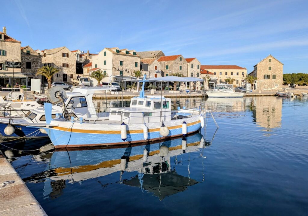 In Rovinj war es gar nicht so einfach, einen freien Blick auf die Altstadt zu erhaschen, weil der Hafen voll mit Jachten, Fischer- und Ausflugsbooten war, die zum Teil die Sicht versperrten. Auch vor Primosten sind ein paar Schiffe angelegt. Diese fallen aber mindestens zwei Nummern kleiner aus als im mondänen Rovinj. Im Hochsommer ist vermutlich auch hier der Teufel los. Jetzt im Dezember kann man das prächtige Städtchen und die schöne Küste in aller Ruhe und fast für sich alleine geniessen. Einfach schön.