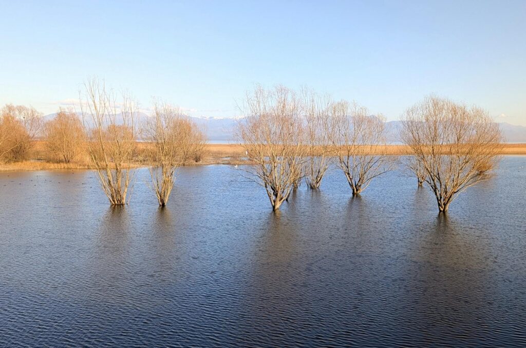 Der Skutarisee ist der grösste See auf der Balkanhalbinsel. Er ist fast fünfzig Kilometer lang. Zwei Drittel des Sees liegen in Montenegro, ein Drittel in Albanien. Landschaftlich ist er einer der schönsten Seen, die ich je gesehen habe. Er ist von schroffen Karstbergen umgeben. Immer wieder ragen dem Ufer entlang kleinere Inseln aus dem Wasser. Dazu gibt es Sumpfgebiete. Bekannt ist der See auch für seine reiche Vogelwelt, zu der auch Pelikane gehören. Pelikane habe ich leider keine sichten können. Die im Wasser stehenden Bäume haben mir aber auch gut gefallen.
