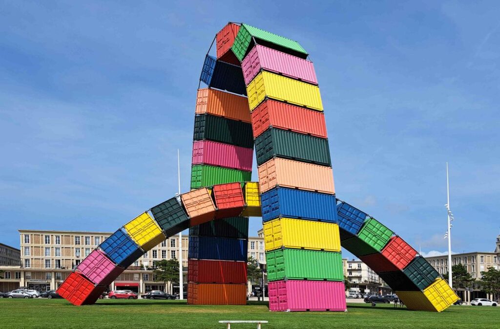 Das Kunstwerk mit den farbigen Containern passt bestens in die Stadt Le Havre. Der Port du Havre gehört zu den grössten Häfen Frankreichs (gemäss Wikipedia soll er nach Marseille der zweitgrösste sein). Im vergangenen Jahr wurden fast 3 Millionen Container umgeschlagen. Bei diesem gewaltigen Umschlag kann man ruhig ein paar leere Container abgeben, um daraus ein Kunstwerk zu schaffen.