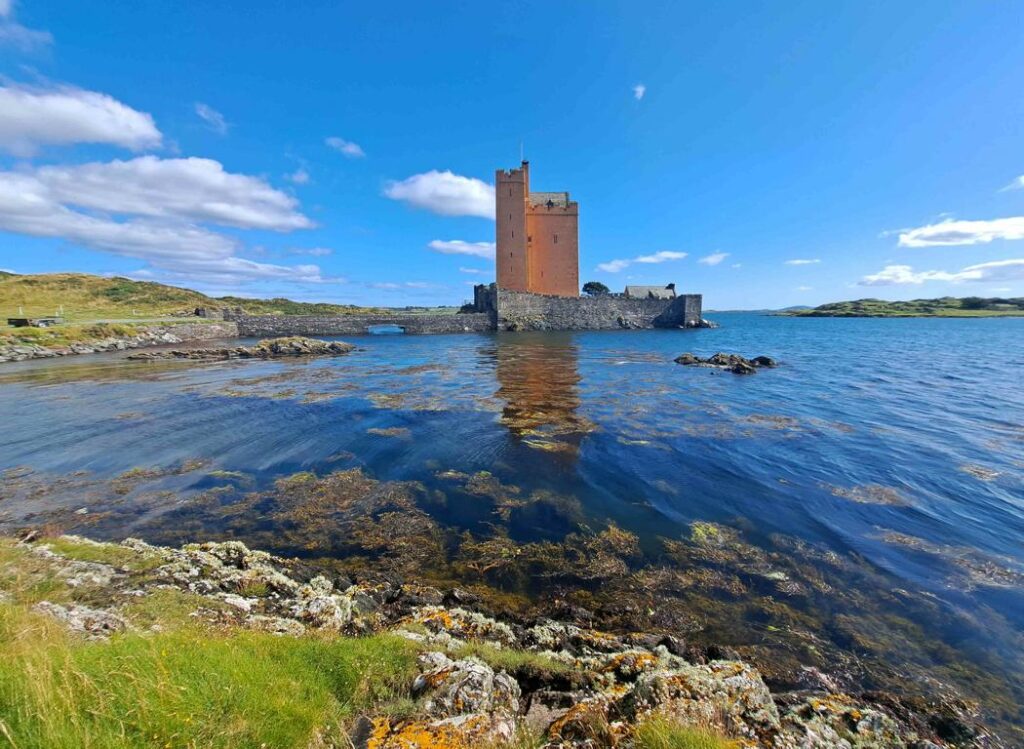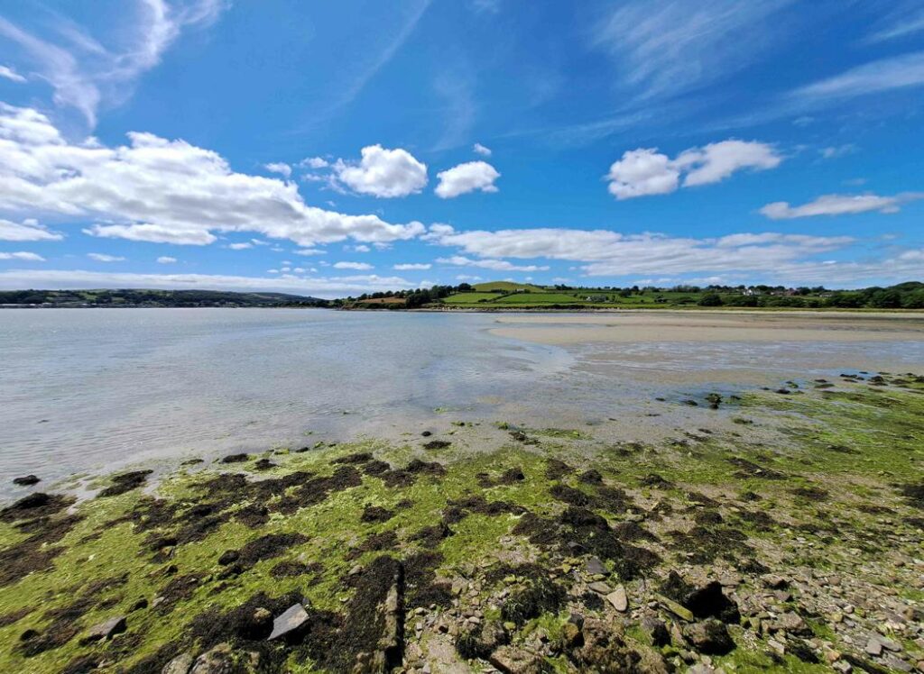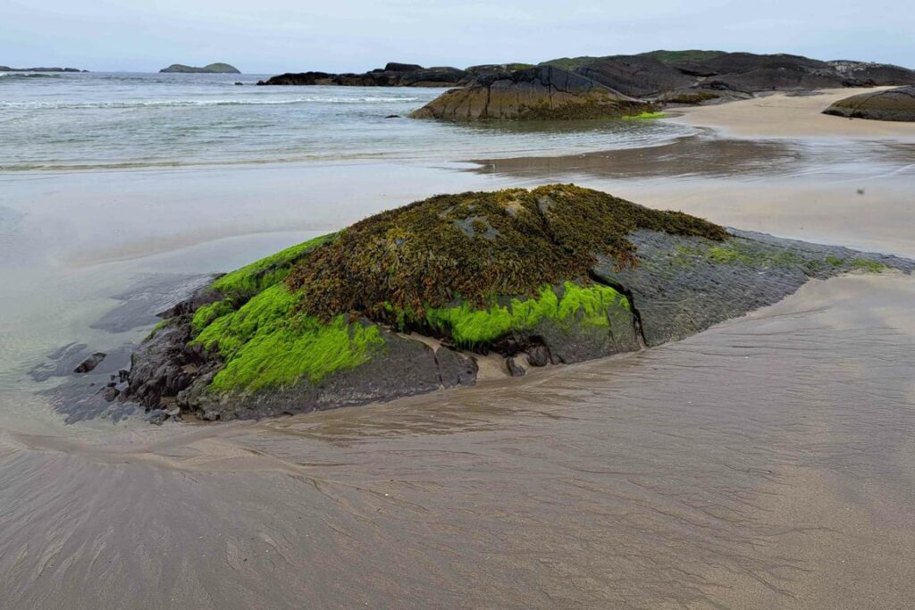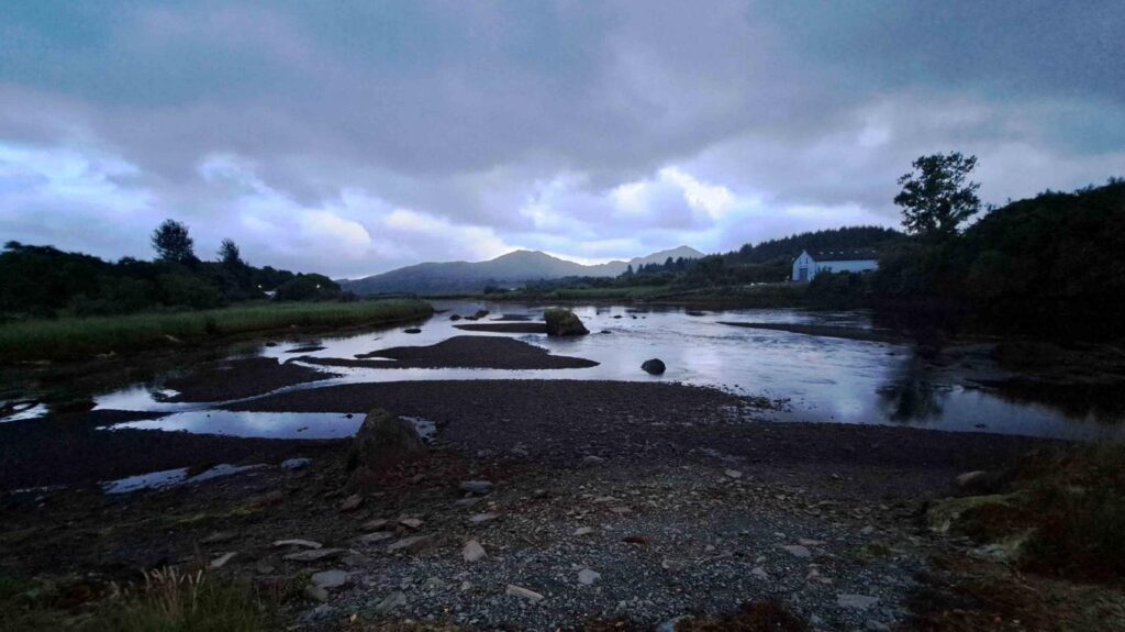 Nach drei Nächten an durchwegs schönen Plätzen im Freien haben wir mit Hopo wieder einmal einen bezahlten Stellplatz angefahren. Zwei Tanks mussten entleert, der Wassertank wieder gefüllt werden. Zu unserer Überraschung waren die besten Plätze direkt am Wasser noch frei. So nächtigen wir wieder einmal unmittelbar am Meer. In Italien, Frankreich oder Spanien müssten wir für so einen Platz zuvorderst an der Front wohl einen satten Zuschlag berappen. Erneut können wir bequem von unserer guten Stube aus verfolgen, wie sich das Meer – oder besser gesagt der bei Sneem tief ins Land hineinreichende Meeresarm – allmählich entleert. Kurz vor dem Eindunkeln dürfen wir noch eine ganz spezielle Stimmung miterleben. Dass es wieder regnet stört für einmal nicht.