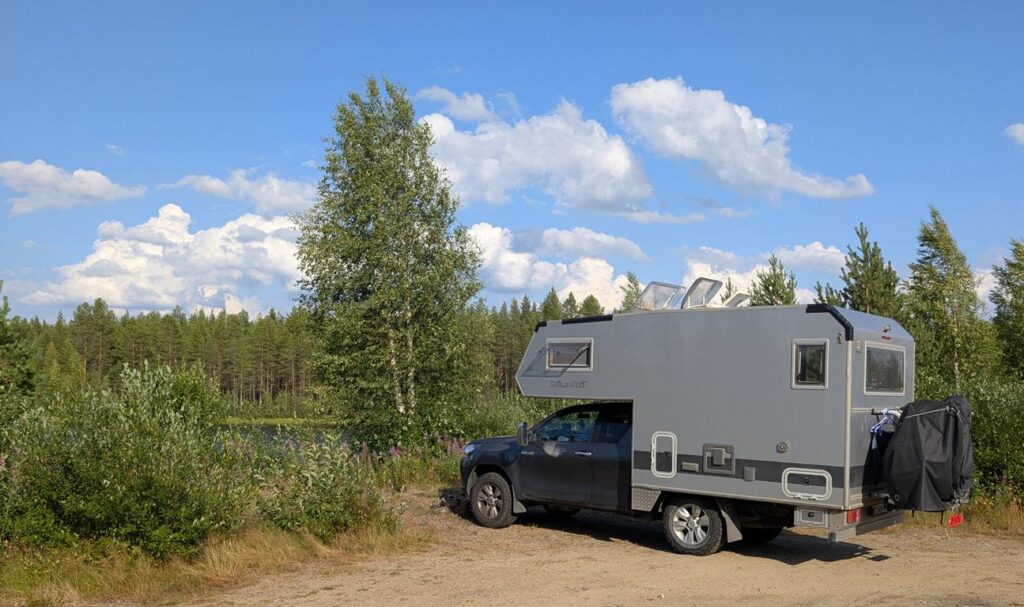 Wir haben wieder einmal einen tollen Übernachtungsplatz gefunden. Wir sind direkt am Fluss Kitinen stationiert, der etwas weiter unten gestaut wird und daher wie ein See aussieht. Es ist ruhig hier, es ist warm, die Natur ist wunderschön, wir sind für uns und es gibt allen Unkenrufen zum Trotz keine Mücken. Und wir haben selbst in der Abgeschiedenheit Internet. Für uns von der Generation Z ist das noch wichtig.