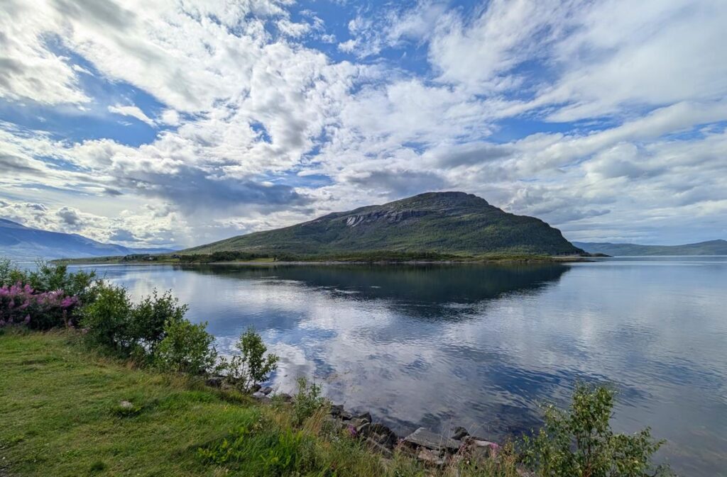 Auf die Insel Sommarøya gelangt man über die Sommarøyabrua. Die Brücke ist gut fünfhundert Meter lang. Sie ist so gebaut, dass sie auch von grossen Schiffen unterfahren werden kann. Vom höchsten Punkt der Brücke aus hat man einen herrlichen Blick auf die Insel Sommarøya und auf die umgebende Küstenlandschaft. Der markante Berg auf der linken Bildhälfte heisst Haja, ist 486 Meter hoch und befindet sich auf der gleichnamigen Insel Haja, die er fast vollständig bedeckt. Es wimmelt hier nur so von kleinen Inseln und Fjorden. Unübersichtlich, aber traumhaft schön.