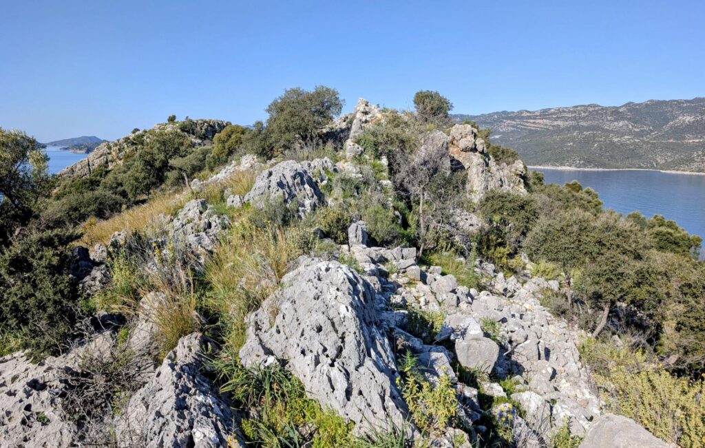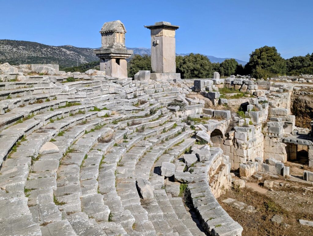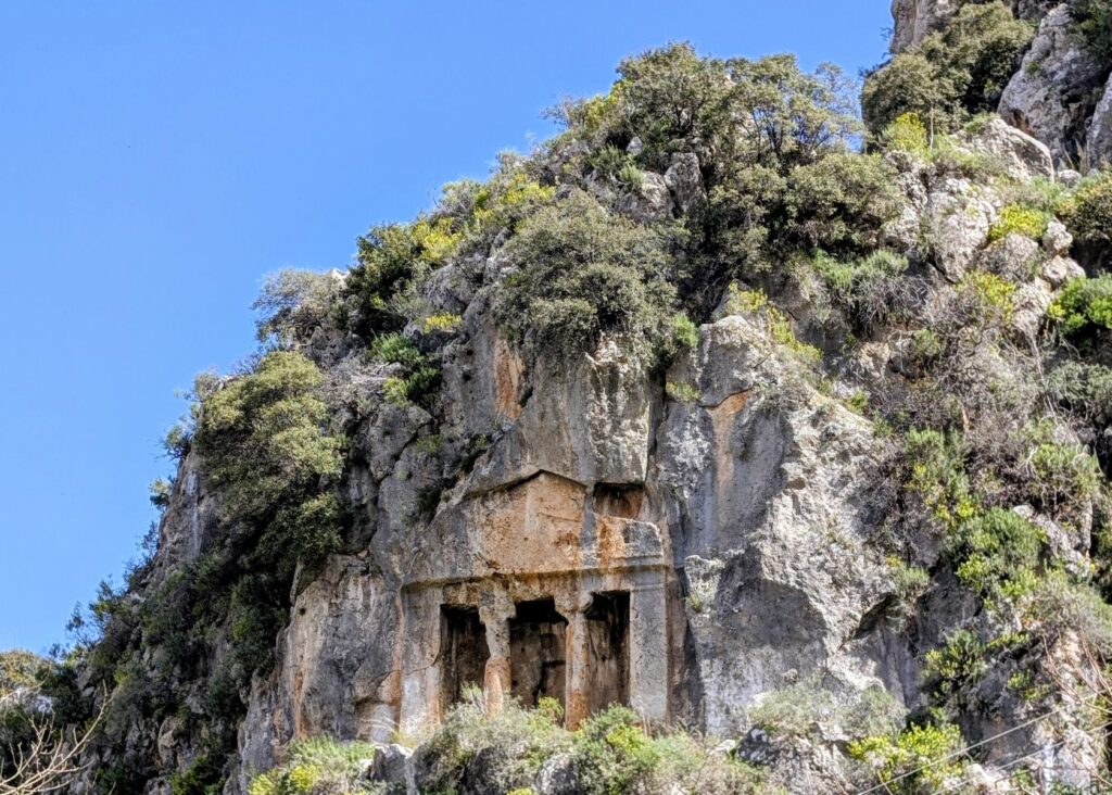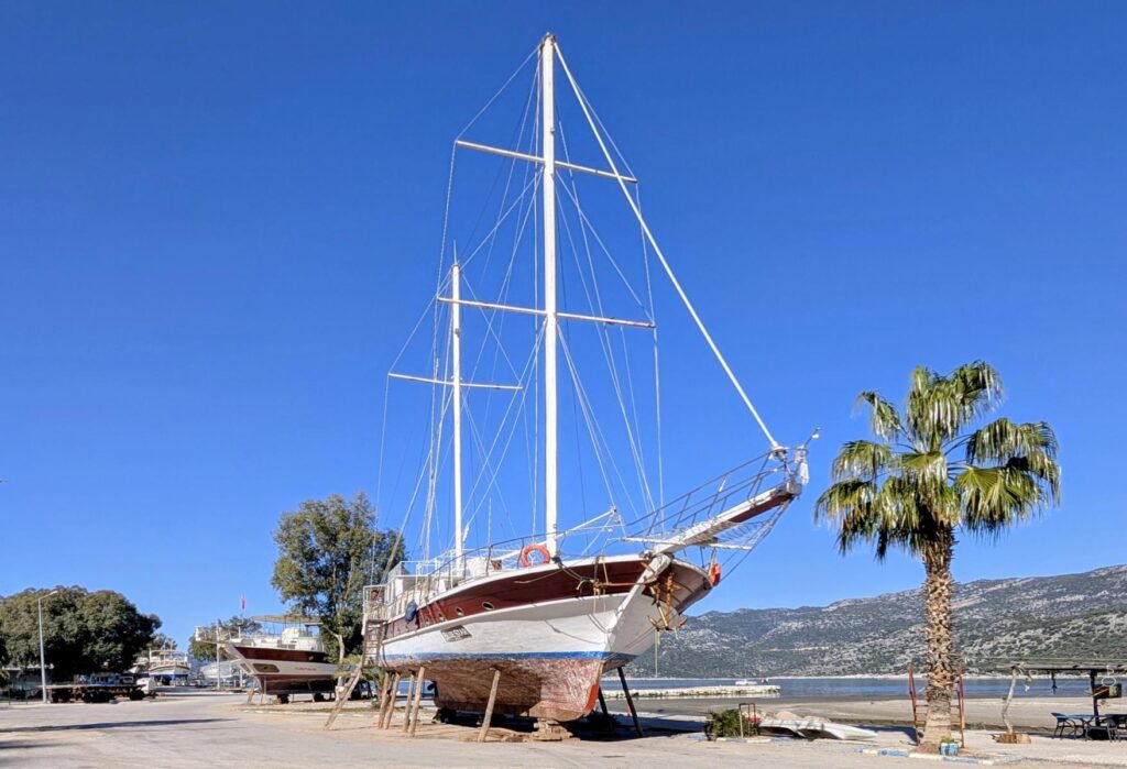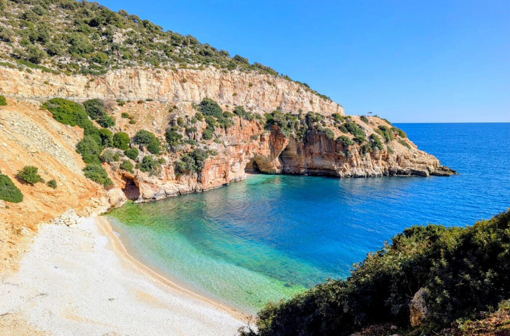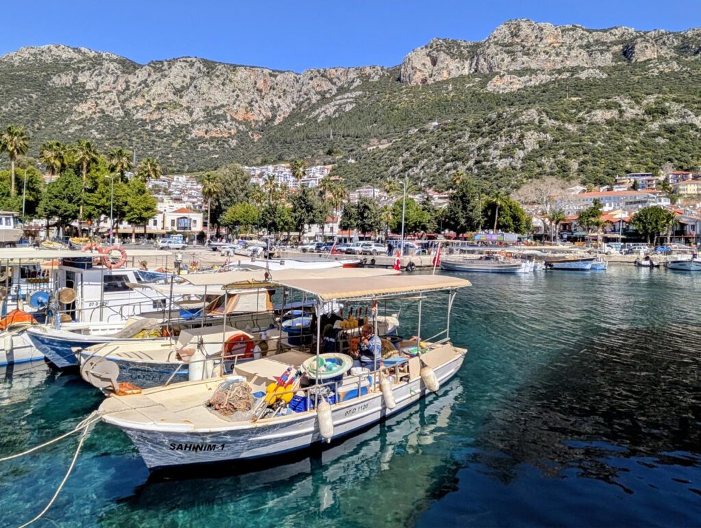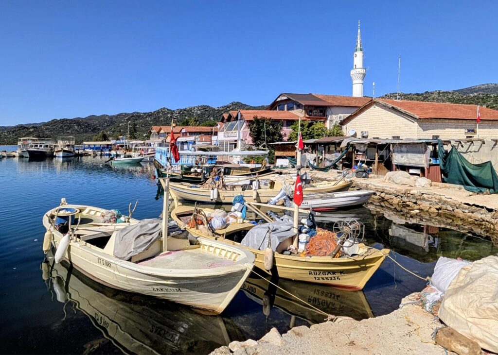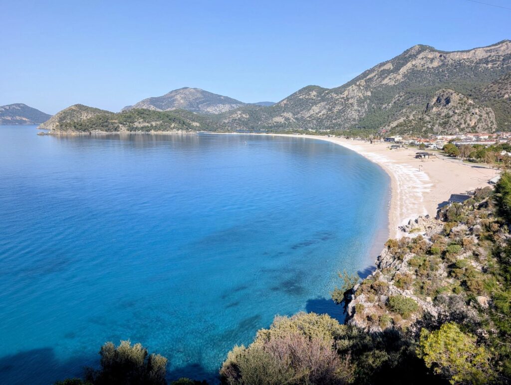Der Strand von Ölüdeniz gilt als einer der schönsten und saubersten in der Türkei. Er ist bekannt für sein türkisfarbenes Wasser. Speziell ist auch die Lage des Ortes mitten in Pinienwäldern und Bergen. Diese Berge machen sich die Gleitschirmflieger zunutze, die in recht grosser Zahl vom Berg Babadag aus starten und am Strand landen. In der Saison soll Ölüdeniz oft überlaufen sein. Davon merken wir zurzeit zum Glück noch nichts. Noch ist es möglich, mitten im Dorf und sehr nahe am Meer im Wohnmobil zu übernachten. Davon können die Reisenden in der Saison wohl nur träumen.