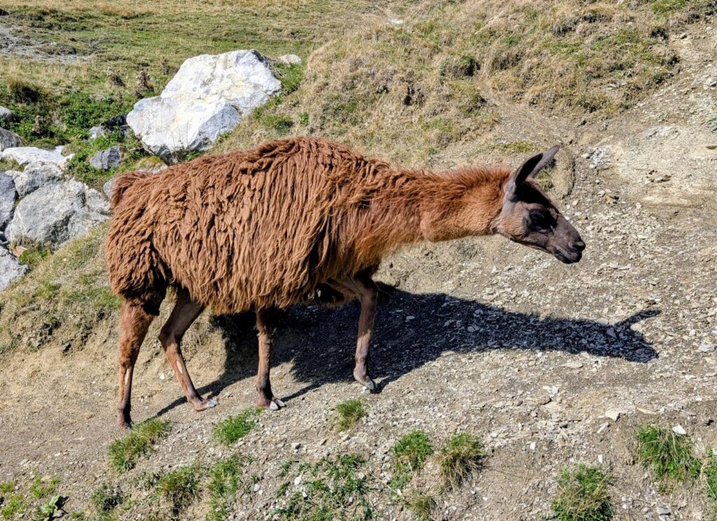 Selbst auf einem viel befahrenen Pass wie dem Tourmalet laufen verschiedene Arten von Weidetieren frei herum und nehmen, wenn ihnen gerade danach ist, die Strassen in Beschlag. Heute hat es mir eine Herde Alpakas angetan, die ich auf über 1’800 Metern angetroffen habe.