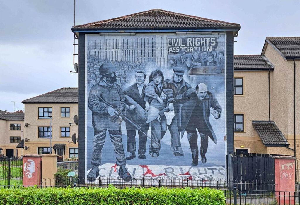 Londonderry blickt auf eine blutige Vergangenheit zurück. Im Nordirlandkonflikt (1968 bis 1998) stand es immer wieder im Mittelpunkt der bürgerkriegsähnlichen Auseinandersetzungen. Insgesamt wurden 16’000 Bombenanschläge, 37’000 Fälle von Schusswaffengebrauch, 22’000 bewaffnete Überfälle und 2’200 Brandanschläge im ganzen Land registriert. Mehr als 3’500 Menschen verloren im Nordirlandkonflikt ihr Leben. In der Rossville Street in Londonderry erinnern etliche eindrückliche Wandgemälde an die Zeit der blutigen Wirren.