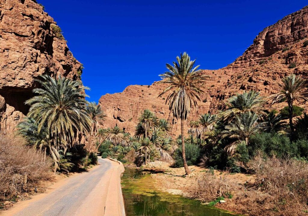 Die Nacht eingangs des Vallée d’Ait Mansour war sehr ruhig. Tagsüber fahren nur wenige Fahrzeuge durch die enge Schlucht. In der Nacht gibt es praktisch keinen Verkehr mehr, da es speziell für Ortsunkundige viel zu gefährlich wäre, die enge, unübersichtliche Strasse zu befahren. Am Vormittag haben wir nochmals einen längeren (zweieinhalbstündigen) Spaziergang durch die Schlucht gemacht. Wirklich herrlich, die Oasenlandschaft mit den vielen Palmen, Mandel- und Olivenbäumen. Hopo hat Lunte gerochen und wollte auch in die Schlucht. Wir haben nachgegeben und haben die ganze Strecke auch noch auf vier Rädern bewältigt. Gut, dass es hier so wenig Verkehr hat, gibt es doch nicht überall ausreichend breite Ausweichstellen. Gestern war ich noch fest der Meinung, dass es eine Dummheit wäre, durch die Schlucht zu fahren. Heute bin ich froh, dass wir es gemacht haben. Die Fahrt war superschön.