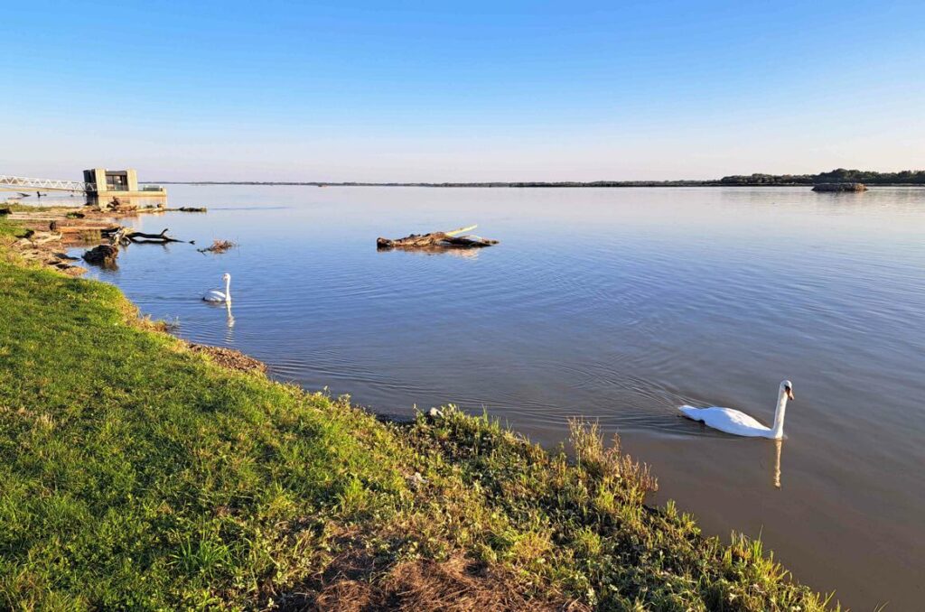 Südöstlich von Bratislava ist die Donau über zig Kilometer gestaut. Entlang des gestauten Flusses führt ein guter Radweg. Ein wahres Vergnügen, an einem herrlichen Spätsommertag dem Wasser entlang zu radeln. Wobei der Blick auf die gestaute Donau mit der Zeit etwas eintönig wird. Dafür kann man nördlich des Flusses prächtige Landschaften und zwischendurch das eine oder andere slowakische Dorf betrachten. Mit der Wahl unseres Übernachtungsplatzes haben wir einen Glücksgriff gelandet. Während der Nacht war es absolut ruhig. Bei Tageslicht konnten wir eine prächtige Landschaft betrachten und ohne Zusatzstrecke unsere Radtour starten.
