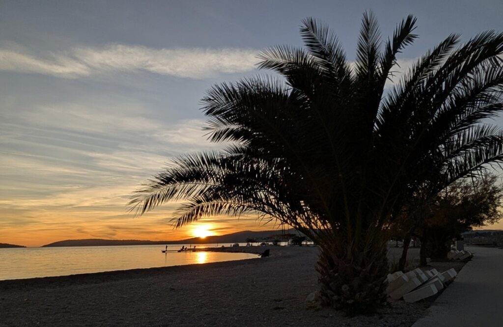 Am elften Tag meiner Reise durfte ich den ersten wirklich schönen Sonnenuntergang erleben. Etwas speziell ist, dass hier die Sonne um diese Jahreszeit bereits um 16.20 Uhr untergeht, also mitten im Nachmittag. Dalmatien liegt doch schon recht weit im Osten und hat, gleich wie wir in der Schweiz oder wie in Spanien, die mitteleuropäische Zeit. Damit wird es recht früh dunkel. Daran muss man sich erst einmal gewöhnen. Und man muss sein Tagesprogramm etwas anpassen, sprich man muss früher rausgehen. Das Besichtigungsprogramm sollte man spätestens um 15.00 Uhr abgeschlossen haben, da es dann bereits zu dunkeln beginnt. Aber alles kein Problem. Solange das frühe Eindunkeln meine grösste Sorge ist, geht es mir bestens.