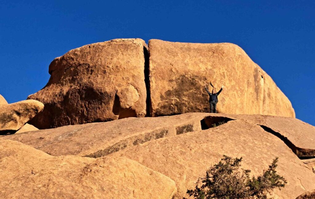 Die Nacht in der Steinwüste war total ruhig und wir haben herrlich geschlafen. Bei Sonnenaufgang (dieser ist bei uns aktuell um 8.15 Uhr) präsentierte sich die Landschaft in ihrem schönsten Gewand. Statt gleich loszufahren haben wir nochmals einen Spaziergang durch die bizarre Felslandschaft unternommen. Wobei Spazieren der falsche Ausdruck ist. Es war mehr ein Herumturnen und teilweise ein leichtes Herumklettern. Die Dimension, die die Felsbrocken zum Teil haben, ist gewaltig. Man beachte nur, wie klein der Blogschreiber mit seinen 1,93 Metern neben dem zweigespaltenen Koloss ist. Rund hundert Meter weiter haben wir noch einige frei lebende Gazellen gesehen. Schöner kann ein Tag kaum beginnen.